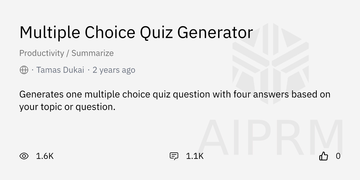 Chatgpt Ai Multiple Choice Generator Free - Generates diverse, educational assessment questions. This prompt is used to generate {n} multiple choice questions based on long text information {text}. Click generate and receive your multiple choice questions complete with explanations for each option. The text can be a summary of a.