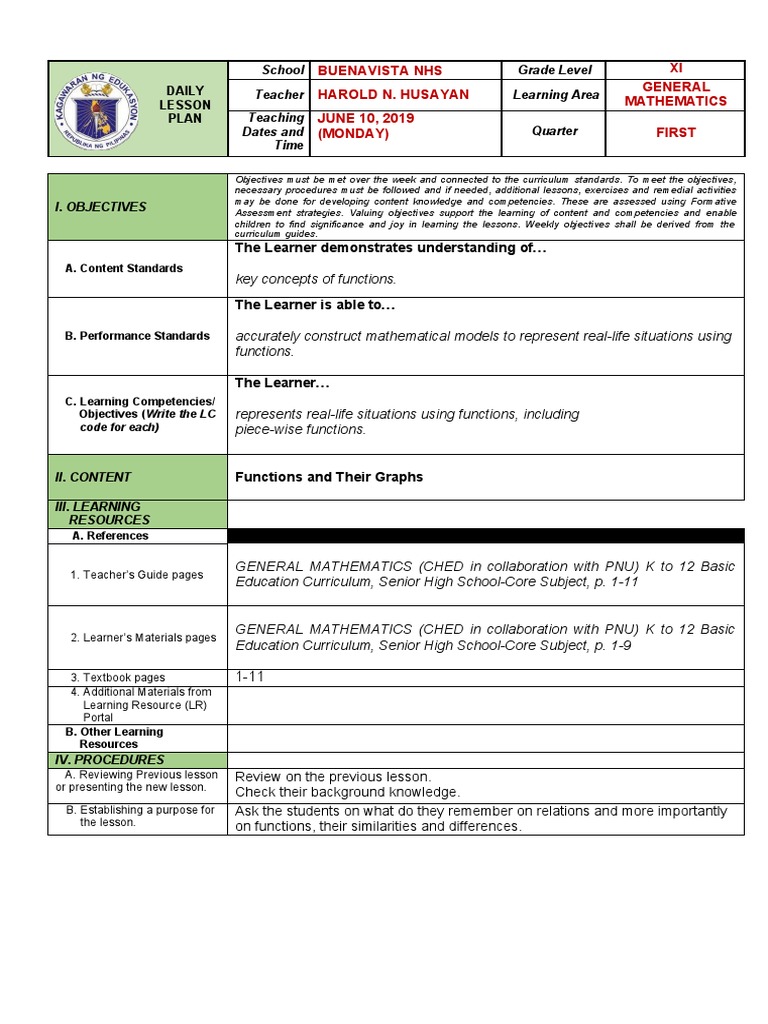 Sample Daily Lesson Plan For General Mathematics Grade 11 PDF