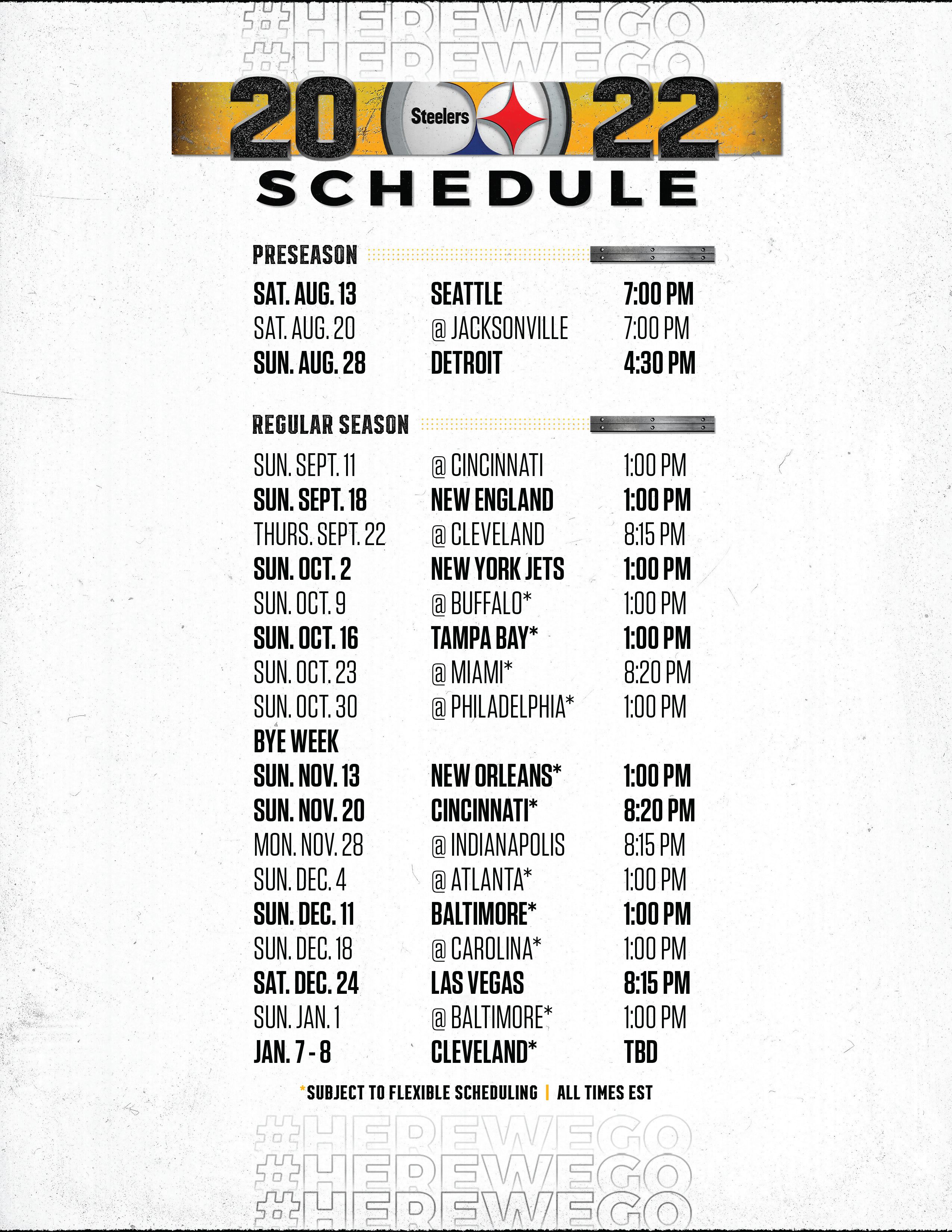 The 2025 nfl season is here. Check out the official 2025 pittsburgh steelers schedule, featuring opponents, dates, times, tv and ticket info. Take a look or download the complete calendar for pittsburgh steelers game schedule in 2025. Includes regular season games, tv listings for games. The official source for the pittsburgh steelers' regular season and preseason schedule, and upcoming steelers.